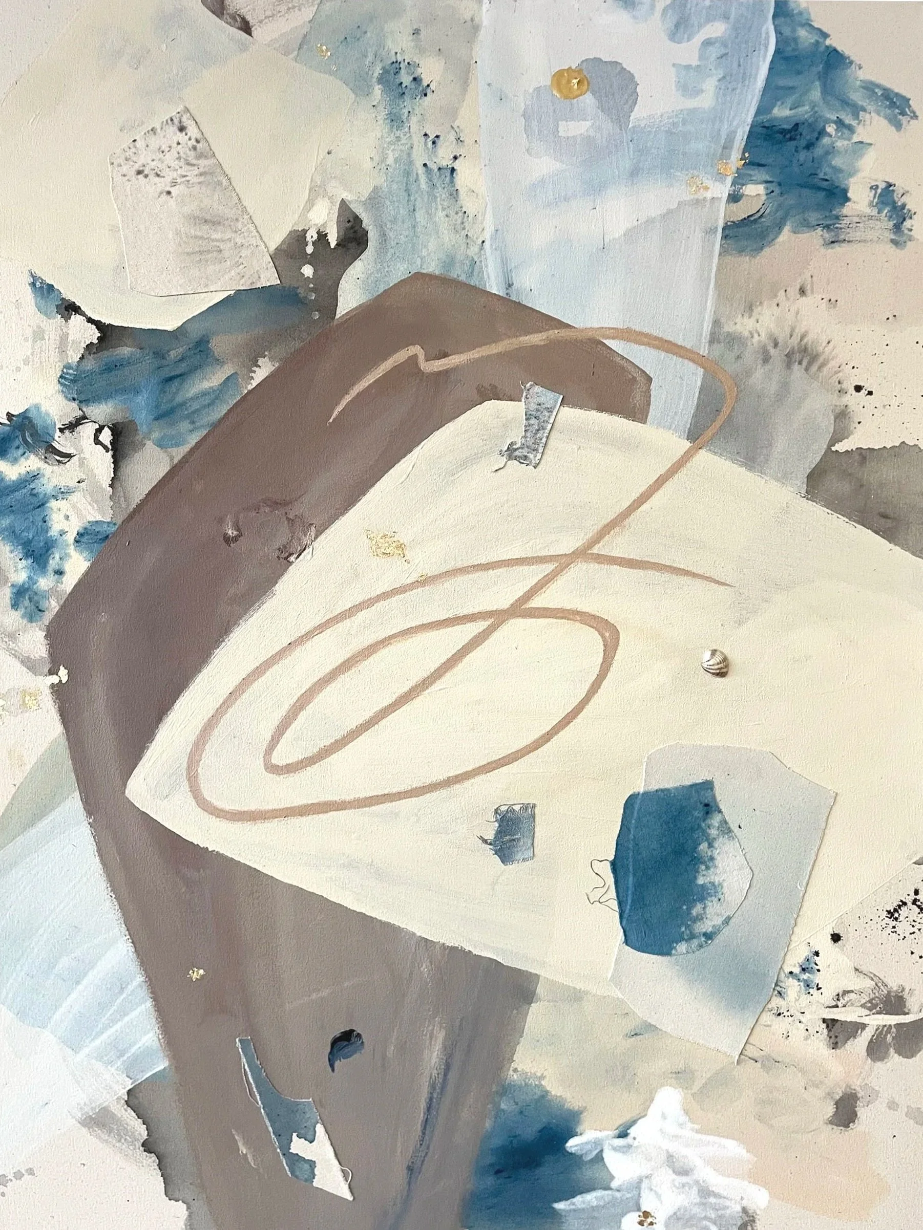 India ink, indigo dye, acrylic paint, gold foil, charcoal, paper collage 48” x 36" $1400Wind And Waves